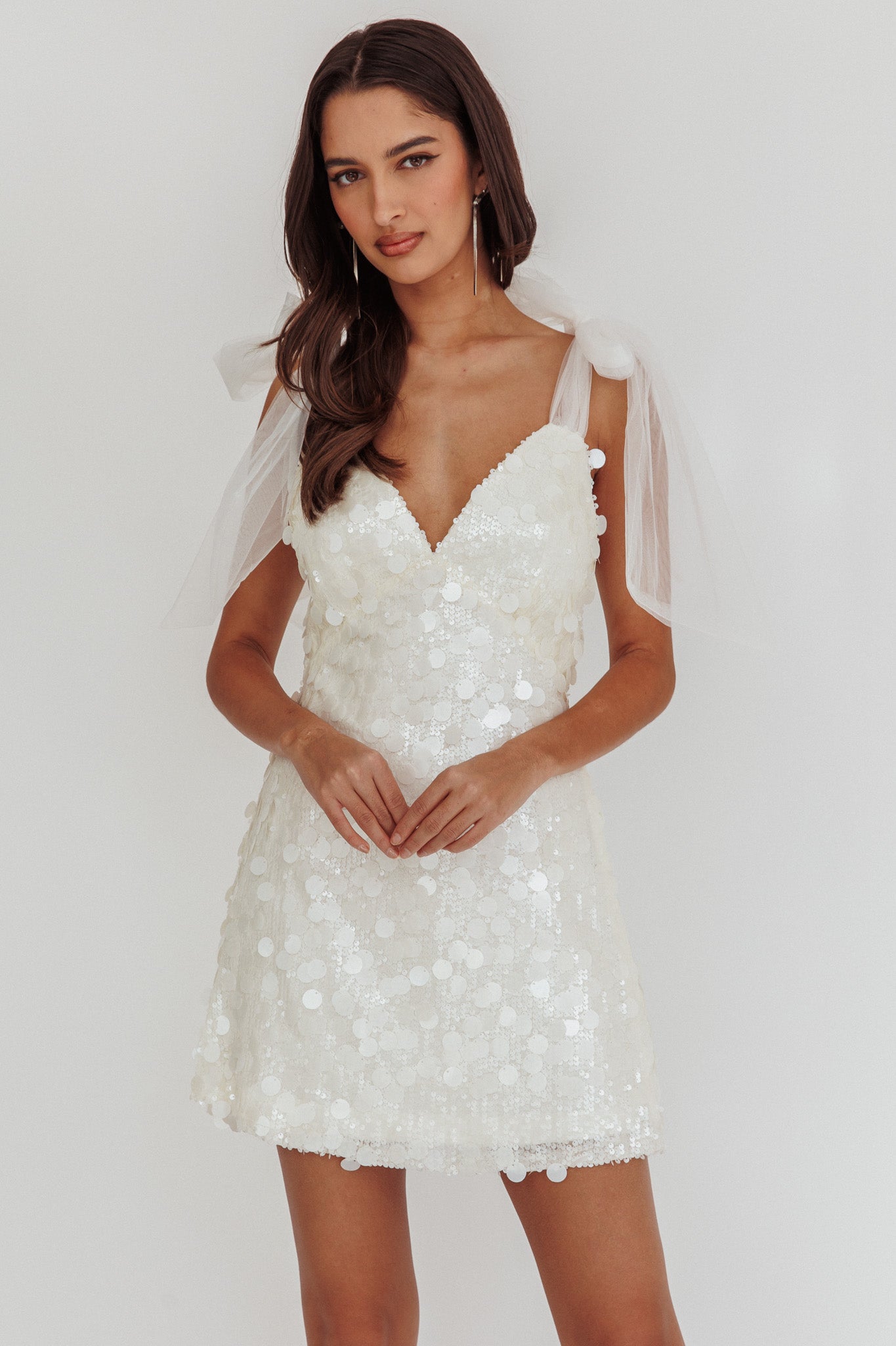 Stunningly beautiful, our Mykonos Morning mini dress is sure to make you the life of the party. Crafted from a playful sequin fabric and featuring tied shoulder straps- this dress is perfect for a bachelorette or birthday party! Complete your look with your favorite jewelry and heels.