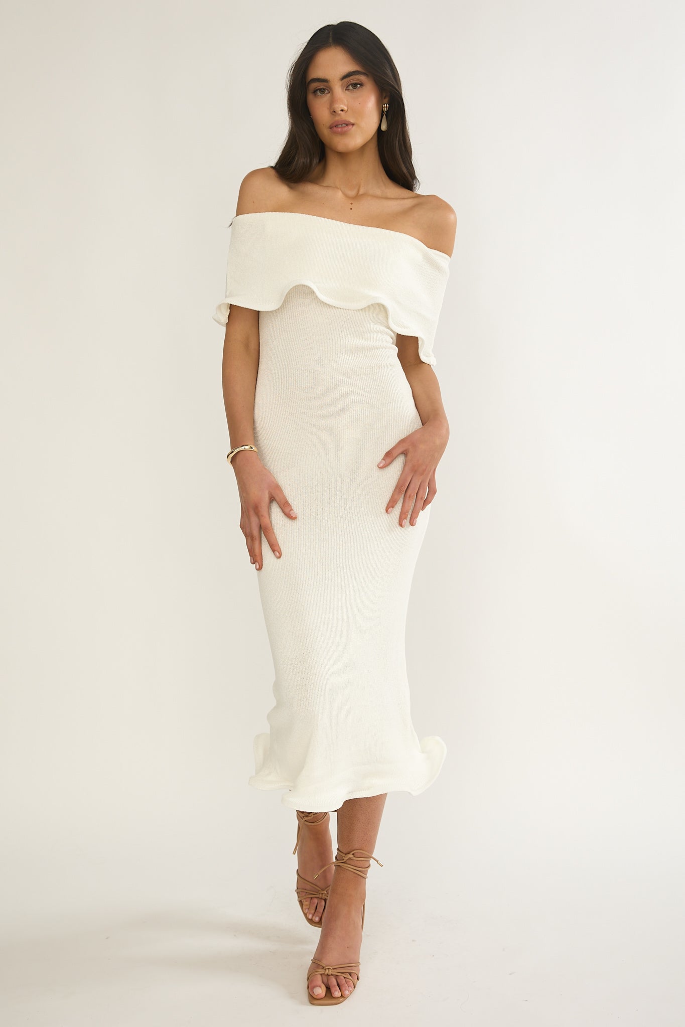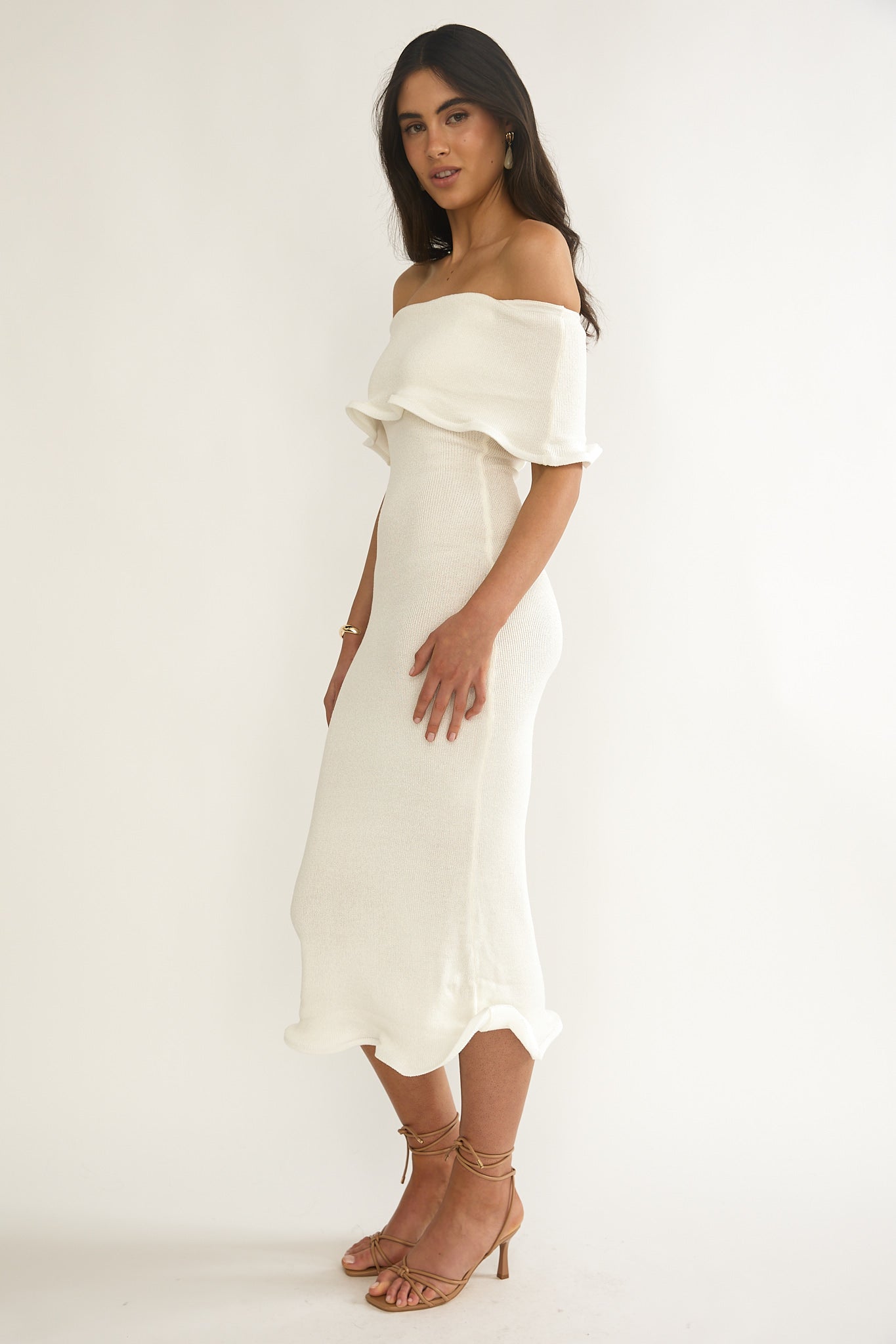 Hello, gorgeous! You will turn heads in our pretty Rayna midi dress. It features a chic, off-shoulder design and lettuce edge detail and is perfect for a flirty date night. Team it with kitten heels and a tote for a cute look.